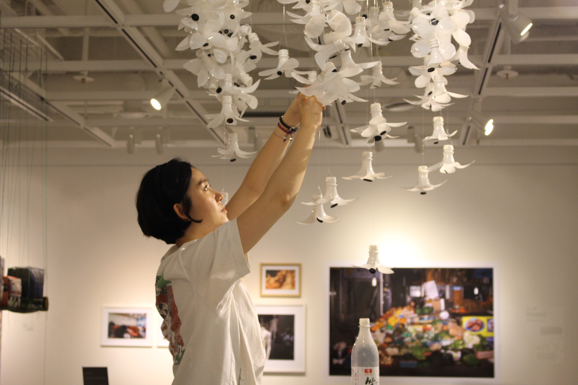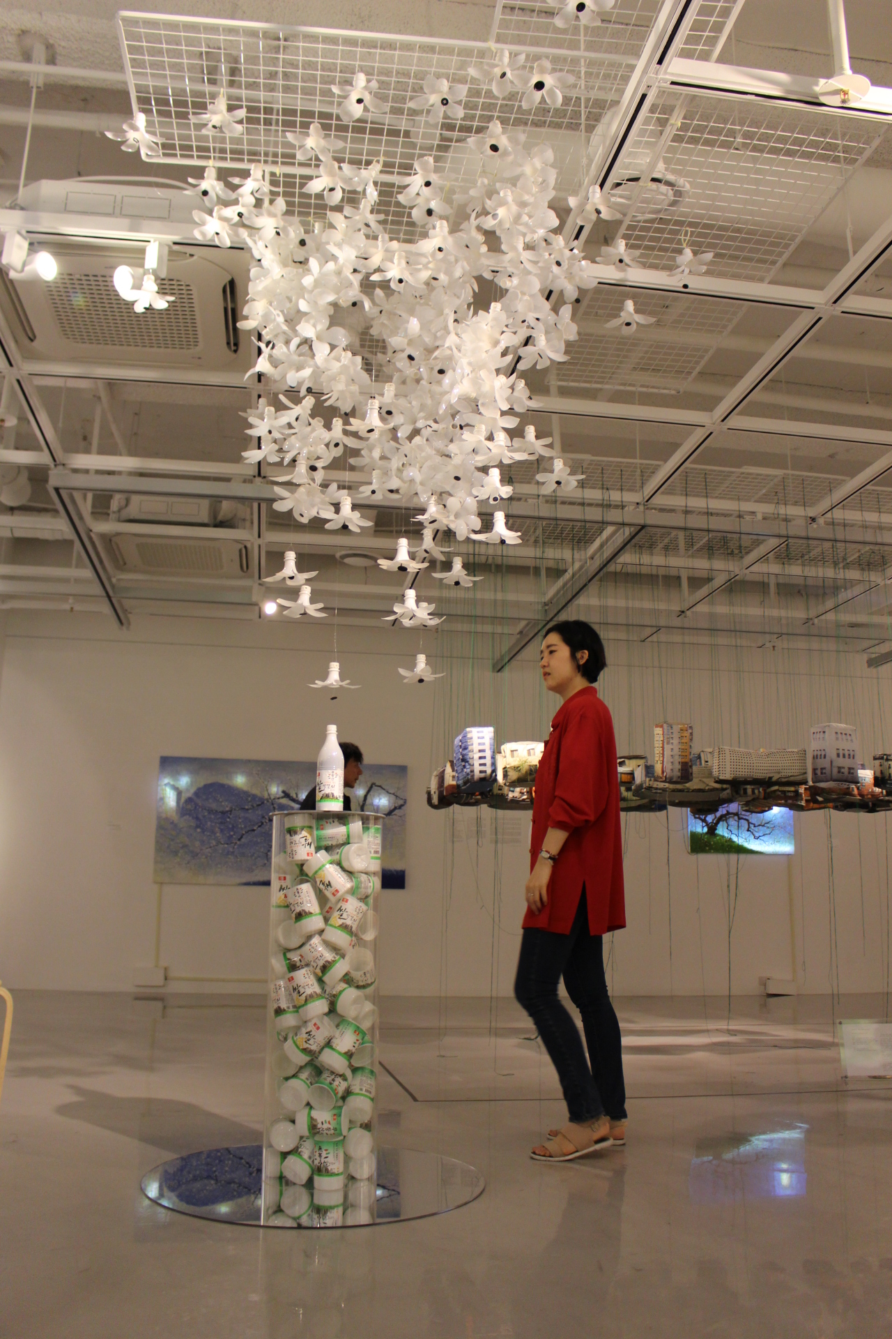 김경란은 일상에서 쉽게 버려지는 물건들에서 작업의 모티브를 얻는다. 작가는 폐비닐, 페트병, 괘종시계 등의 재활용품들을 재구성하는 과정을 통해, 끝은 또 다른 시작임을 강조한다. 설치작품 <끝과 시작 사이>에서 볼 수 있는 화려한 꽃 무더기는 광주 사람이라면 누구나 알 수 있는, 한 막걸리 브랜드의 페트병이 주 재료이다. 선명한 화이트 플라워로 재탄생한 막걸리병, 그것의 의외성이 흥미롭기도 하지만, 서민의 애환 혹은 시금털털함으로 대변되는 매체의 화려한 변신이 일상에 대한 일종의 대리만족을 선사한다.
